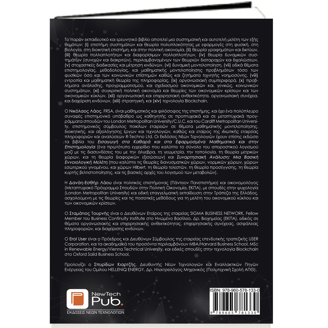 Το παρόν εκπαιδευτικό και ερευνητικό βιβλίο αποτελεί μια συστηματική και αυτοτελή μελέτη των εξής θεμάτων: (i) επιστήμη συστημάτων και θεωρία πολυπλοκότητας με εφαρμογές στη φυσική, στη βιολογία, στη διοικητική επιστήμη, και στην πολιτική οικονομία, (ii) θεωρία γραφημάτων και δικτύων, (iii) θεωρία πολλαπλοτήτων και διαφορίσιμων πολλαπλοτήτων, (iv) θεωρία δυναμικών συστημάτων (συνεχών και διακριτών), περιλαμβανομένων των θεωριών διαταραχών και διχαλώσεων, (v) στοχαστικές διαδικασίες και μέτρηση κινδύνων, (vi) δυναμική μοντελοποίηση, (vii) ειδικά θέματα επιστημολογίας, μεθοδολογίας, και μαθηματικής μοντελοποίησης προβλημάτων τόσο των φυσικών όσο και των κοινωνικών επιστημών καθώς και ζητήματα τεχνητής νοημοσύνης, (viii) εντροπία και μαθηματική θεωρία της πληροφορίας, (ix) οργανωσιακή συμπεριφορά, (x) προβλήματα ανάλυσης, προγραμματισμού, και σχεδιασμού οικονομικών και, γενικώς, κοινωνικών συστημάτων, (xi) συγκριτική πολιτική οικονομία και θεωρίες των οικονομικών κρίσεων και των οικονομικών κύκλων, (xii) οργανωσιακή και επιχειρησιακή ανθεκτικότητα, οργανωσιακή συνέχεια, και διαχείριση κινδύνων, (xiii) στρατηγική, και (xiv) τεχνολογία Blockchain.
